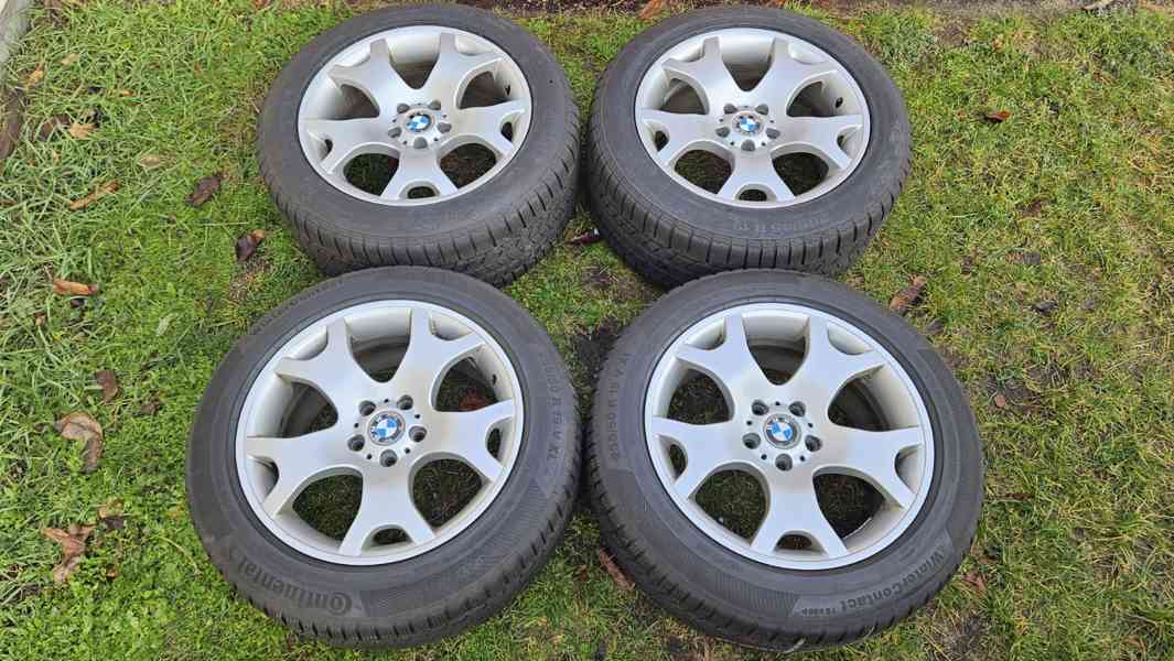 BMW X5 zimní pneumatiky 2x Continental CrossContact Winter 285/45 R19 111V ( nové nikdy nejeté vzorek 9mm) a 2x Continental WinterContact TS850P 255/50 R19 107V ( minimálně jeté vzorek 8mm) originál elektrony, alu disky kola 2x 10Jx19 IS45 a 2x 9Jx19 IS48, cena je uvedena za sadu 4 kusů kol, vyzvednutí Kralupy, X6, dvourozměr 19".