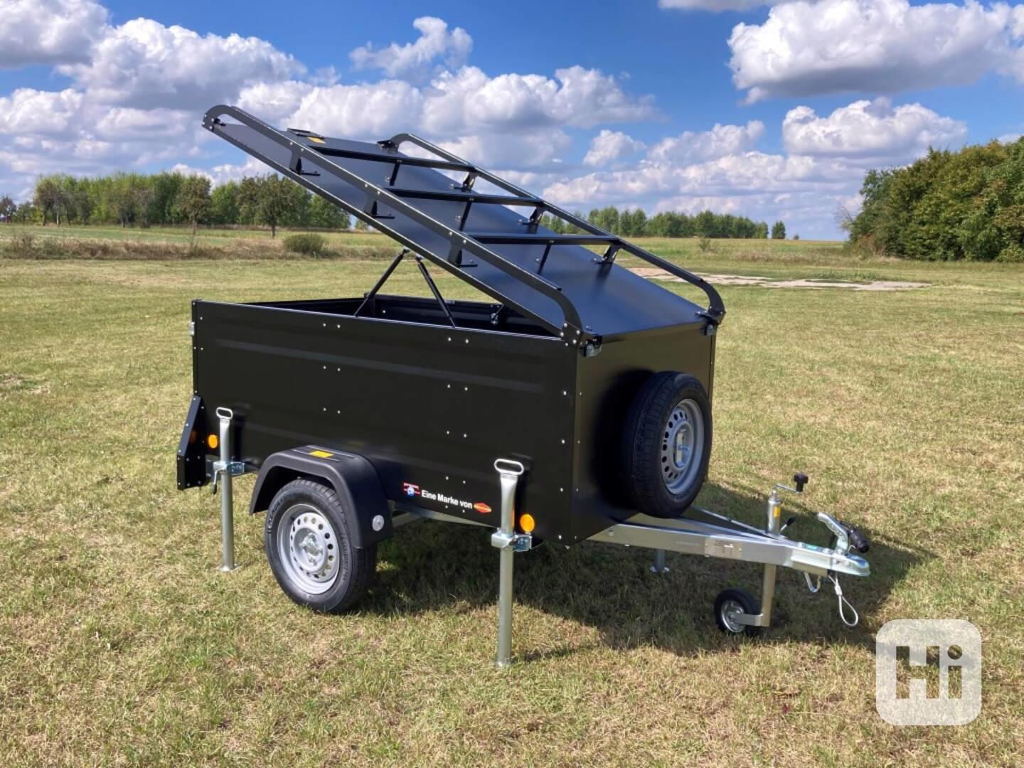 Jednonápravový skříňový přívěs v černé barvě s krytem odolným proti stříkající vodě, který lze zvednout a uzamknout. Černé KTL a práškově lakované víko je standardně vybaveno kolejnicí, abyste mohli snadno namontovat nosiče jízdních kol nebo střešní box. Poklop je speciálně vyvinut pro instalaci střešního stanu s nosností 250Kg.